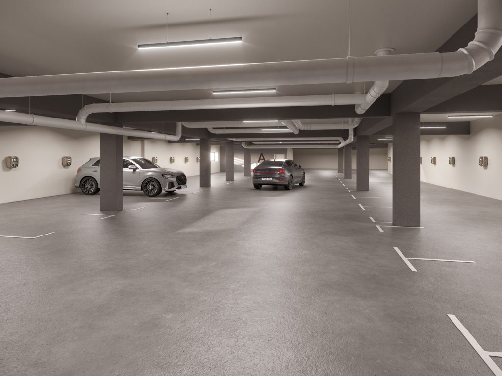 Garaget har 27 parkeringsplatser, samtliga med laddare för eldrift. Föreningen har också ett väl tilltaget cykelförråd med plats för cykelservice. Från gården når man också den gemensamma grovtvättstugan som är ett komplement till lägenheternas egen utrustning (samtliga lägenheter har tvättmaskin och torktumlare).