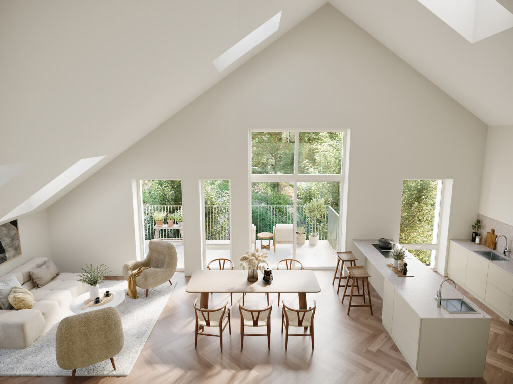 Föreningens fyror präglas av generösa ytor och tilltagna uteplatser. Lägenheterna är mellan 87- 118 kvm stora, samtliga försedda med dubbla badrum och vissa även med separat tvättstugedel. Fyra stycken är Top Floors med möblerbara loft. Tilltagen förvaring, stora sociala ytor och ett fantastiskt ljusinsläpp – flera lägenheter med ljusinsläpp från tre väderstreck – är utmärkande för dessa lägenheter. Se alla fyror i bostadsväljaren.